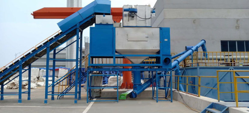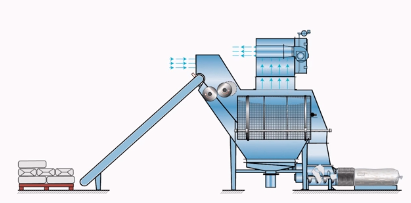 小袋自動拆包機由人工或機器人將包裝袋放到輸送機上,進行輸送到指定位置,或進入破碎機后自動拆包,物料自動分離落入下游設(shè)備。廢袋自動分離后自動壓縮,拆包的過程中產(chǎn)生的揚塵由過濾除塵器凈化過濾達標后排出。
